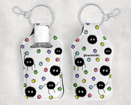 Stitched neoprene hand sanitizer case with keyring. 1 ounce bottle included.